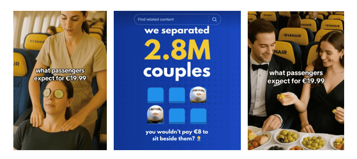 Then there is Ryanair. In a category (airlines) where every competitor uses stock-style imagery of smiling families and legroom that doesn't exist, Ryanair does the opposite. Their social media is famously "unhinged," mocking their own lack of luxury and their customers' complaints.